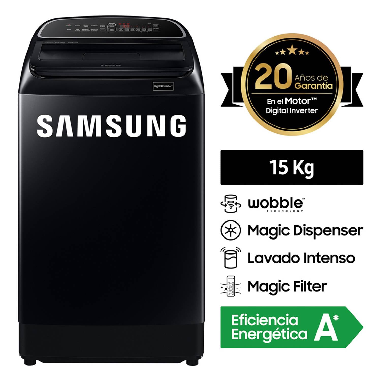 La Lavadora Samsung WA15T5260BV de 15 kg es una excelente opción para familias que buscan un electrodoméstico potente, eficiente y elegante. Con su motor Eco Inverter, tecnología avanzada y su diseño moderno en color negro, esta lavadora garantiza un lavado eficaz, silencioso y con un bajo consumo de energía. Es ideal para lavar grandes volúmenes de ropa sin sacrificar el rendimiento ni la calidad de limpieza.