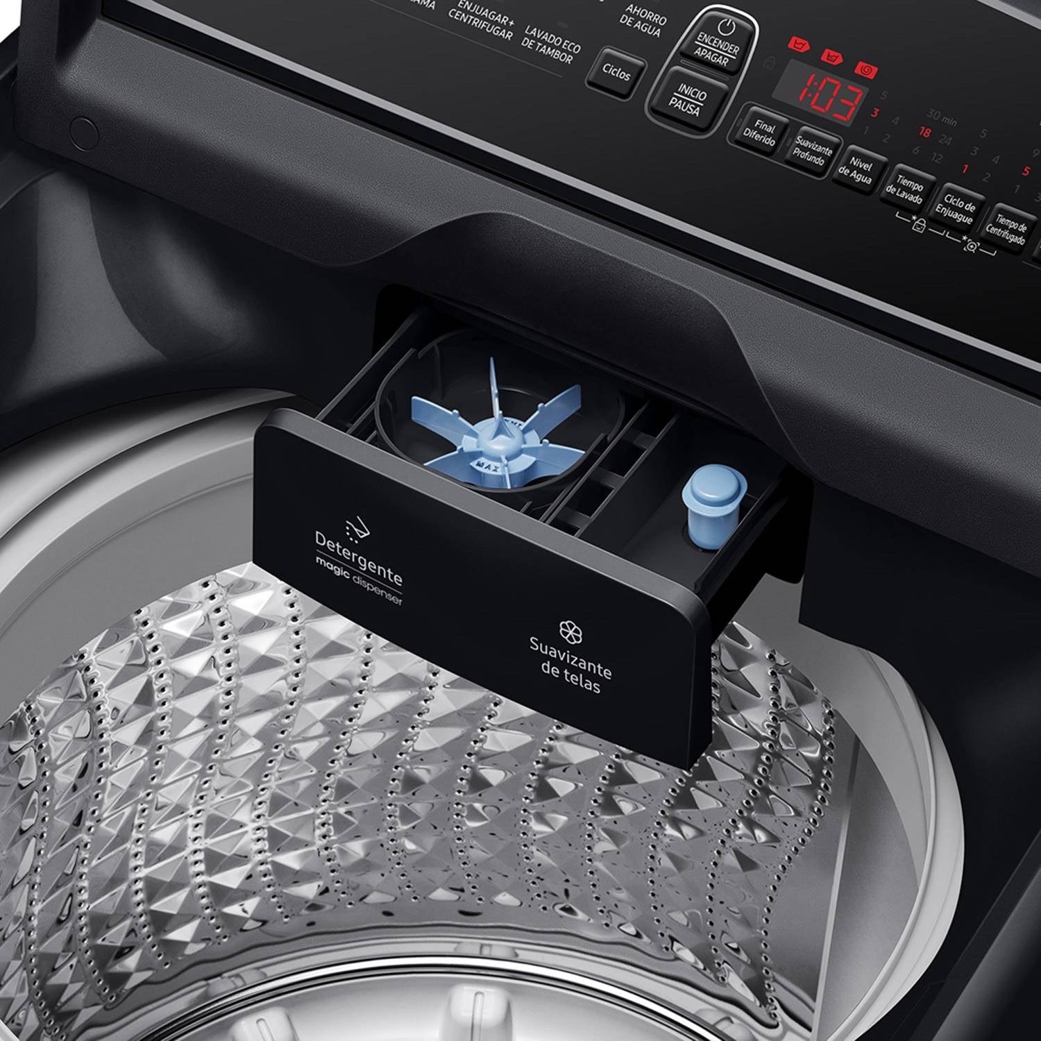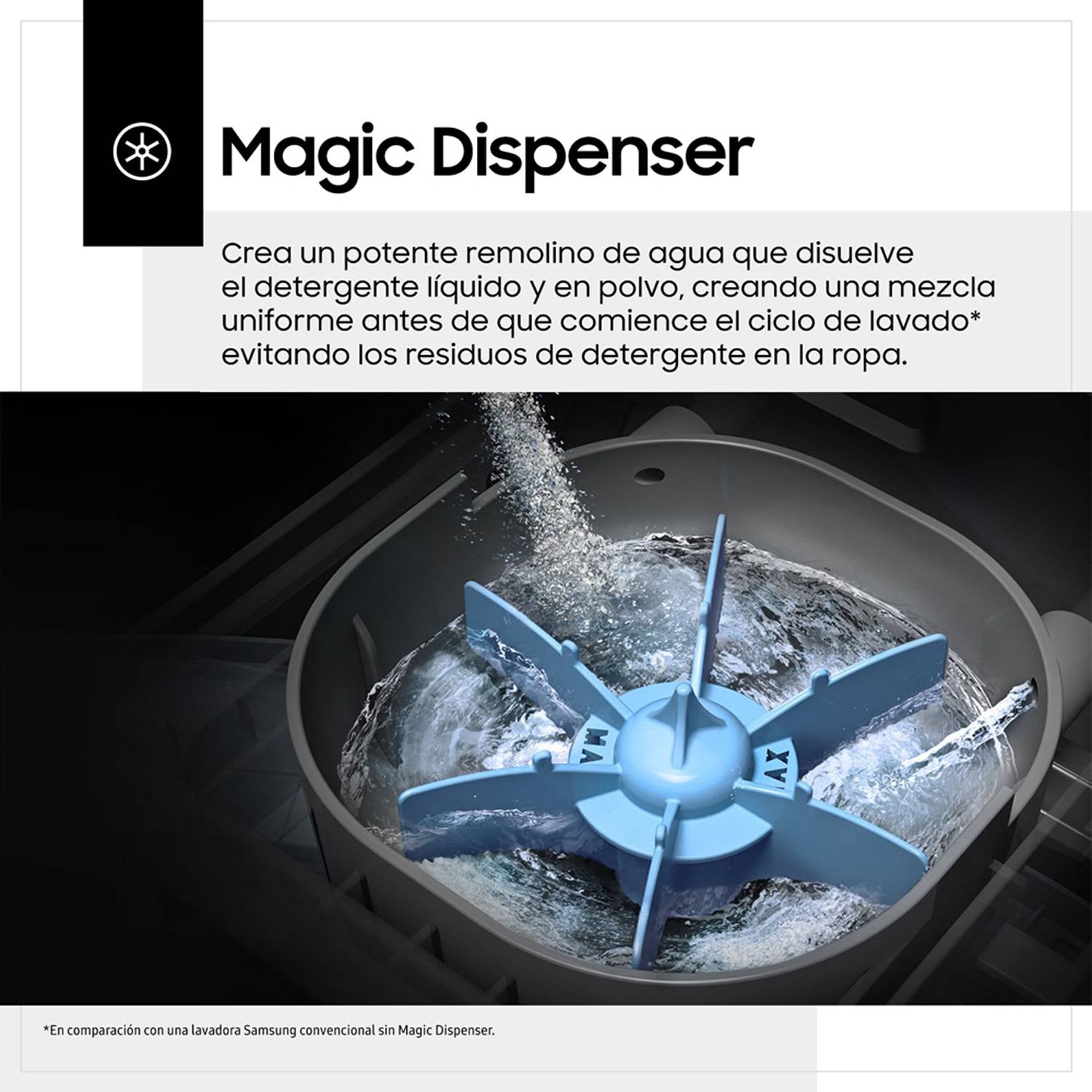 Magic Dispenser: El Magic Dispenser disuelve uniformemente el detergente antes de que entre en contacto con la ropa, lo que evita que queden residuos de detergente en las prendas y garantiza un lavado más eficaz y uniforme.