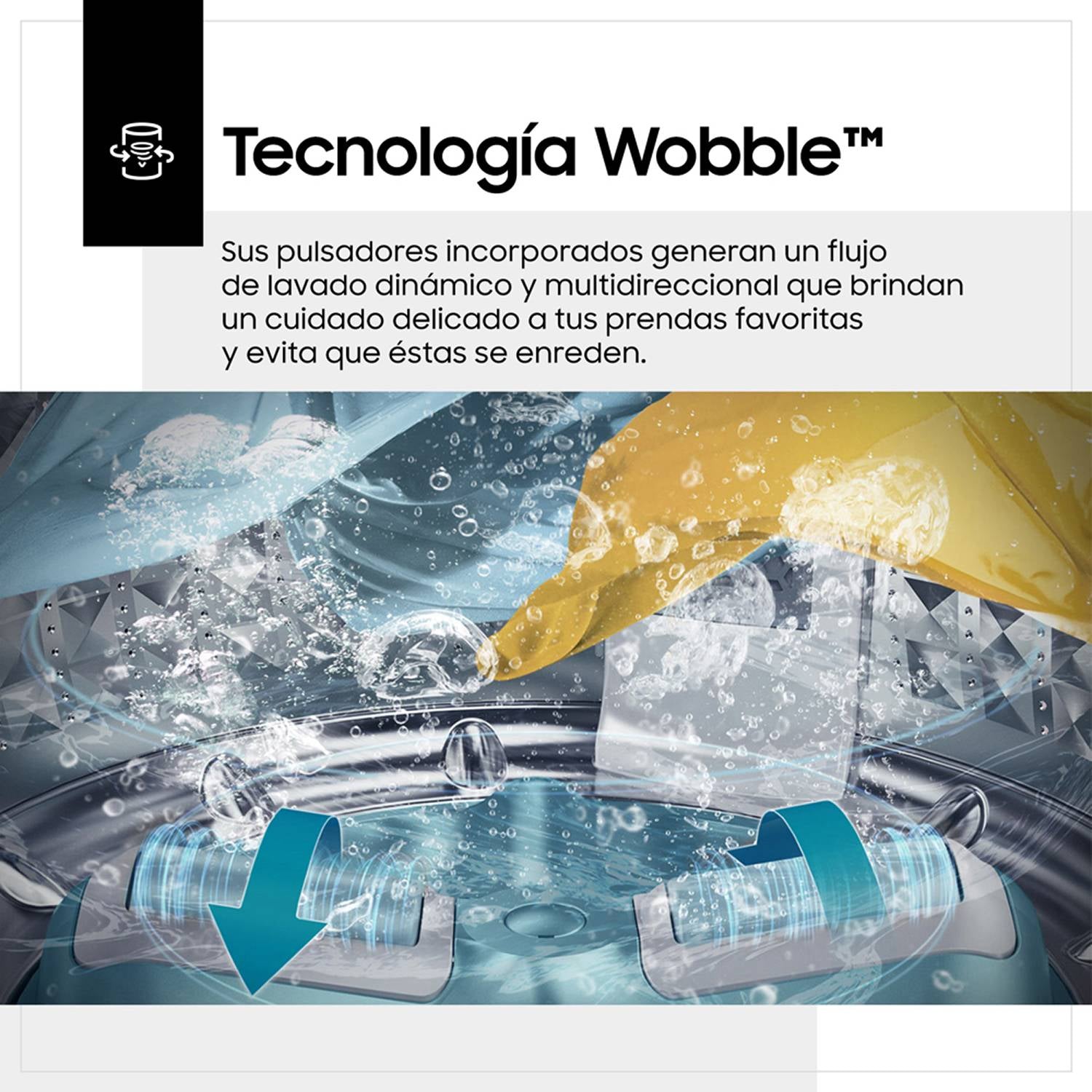 Tecnología Wobble: La innovadora tecnología Wobble de Samsung evita que la ropa se enrede y se dañe, asegurando un lavado delicado y eficiente. Los pulsadores Wobble generan corrientes multidireccionales que permiten un lavado más suave, cuidando las telas delicadas y evitando la fricción excesiva entre las prendas.